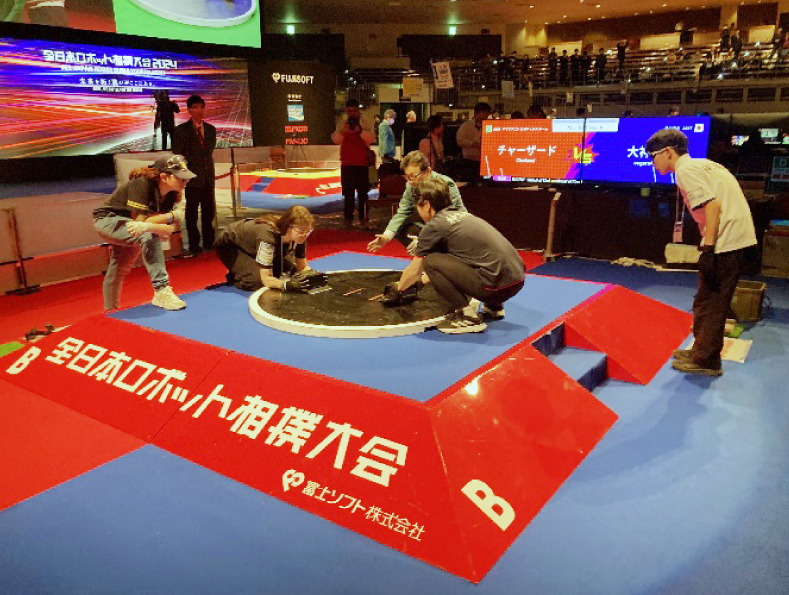 1989年より開催されている日本最大級のロボットの競技大会で、参加者が自作したロボットを「力士」に見立て、土俵上に2台のロボットを置き、どちらかのロボットを土俵外に押し出すことで勝敗が決まります。プログラムで自動制御される自立型と操縦者がリモコンで操作するラジコン型があります。ロボット製作を通じて「ものづくり」の楽しさや技術力の向上を目指し、世界30か国以上の国や地域で取り組まれているロボット競技です。