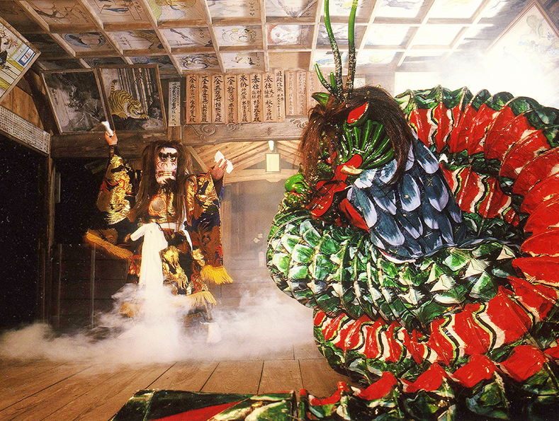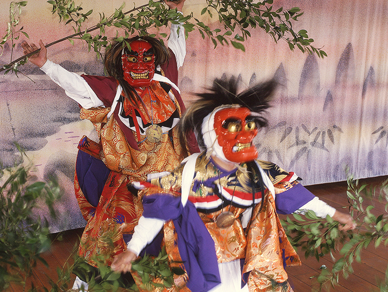 由布市庄内町には12の神楽座があり、庄内神楽の伝統を守っています。5月~10月の第3土曜日には各神楽座が出演する「定期公演」が開かれ、11月にはすべての神楽座が一堂に会する「庄内神楽祭り」が行われ、数千人の神楽ファンを酔わせます。